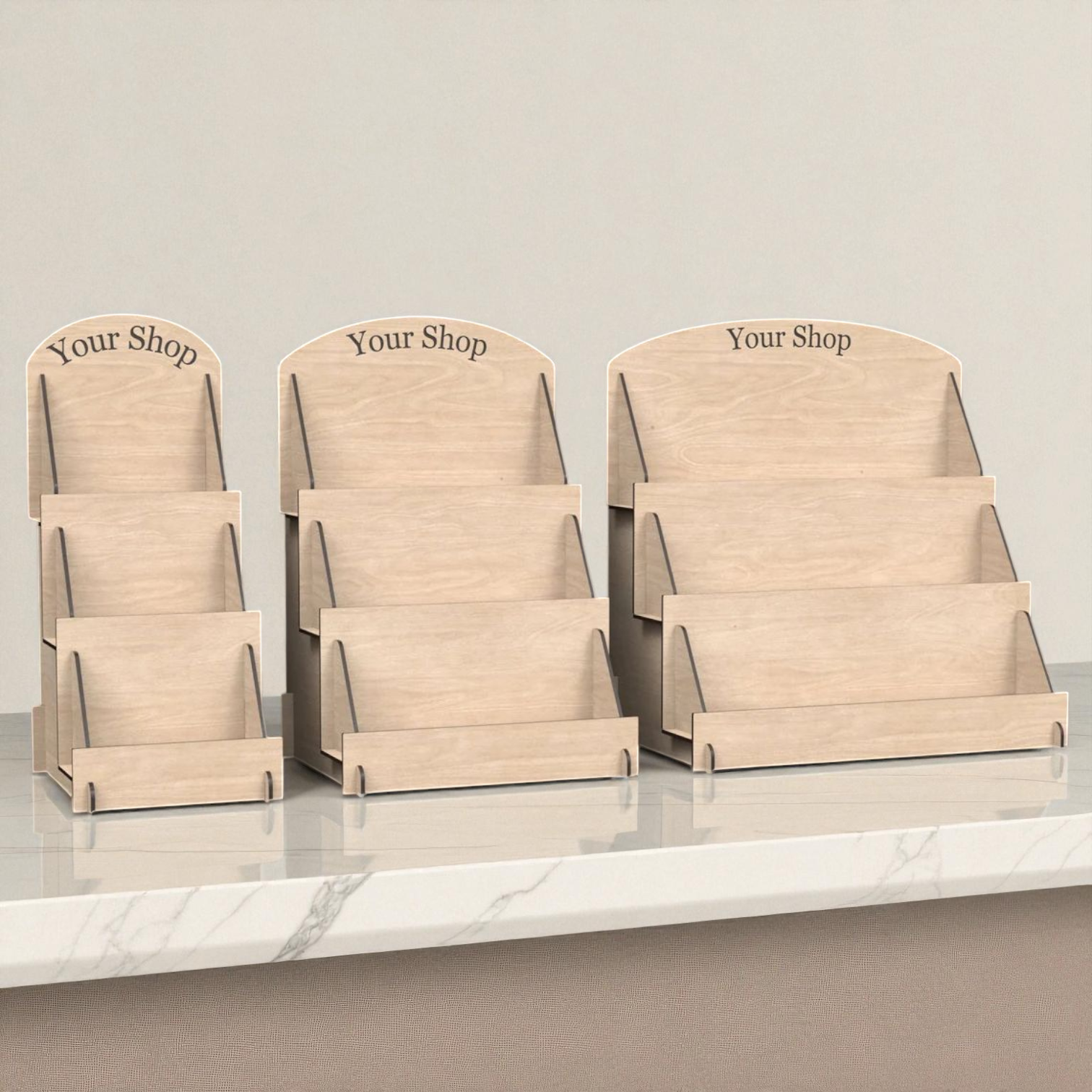 Model 3 : Daha büyük bir teşhire ihtiyaç duyanlar için 30 cm x 5,6 cm dahili raf boyutuna sahip 33 cm Genişlik x 20 cm Derinlik x 34 cm Yükseklik ölçülerindeki en büyük stand, göz alıcı bir sunum garanti eder.