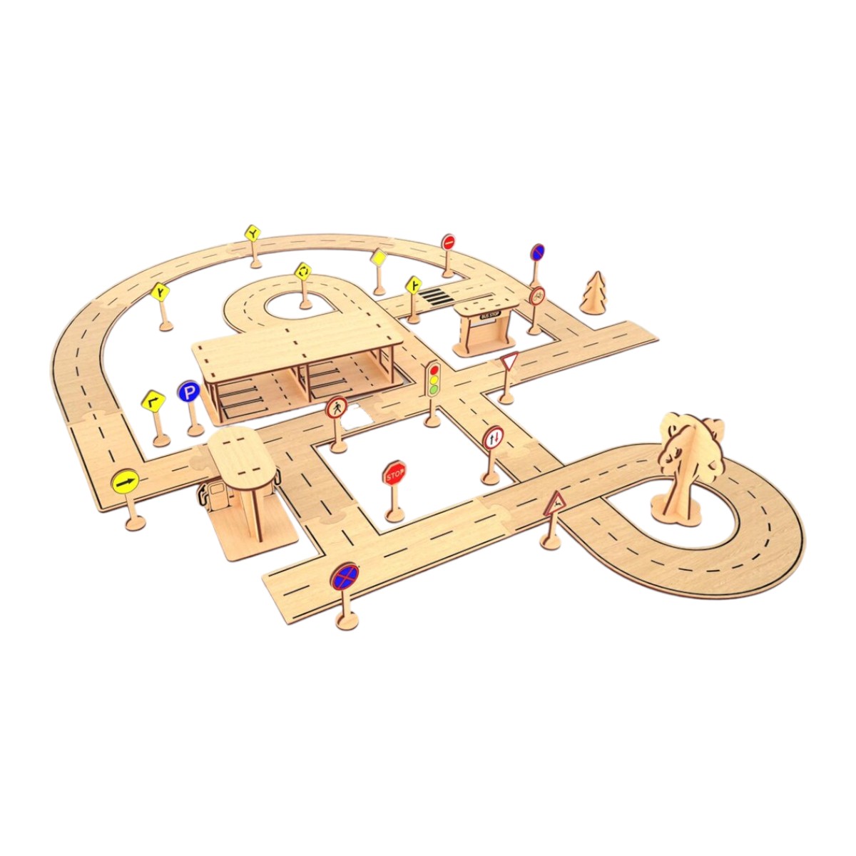 3 mm MDF malzemeden lazer kesim yöntemi ile üretilen araç parkuru, geniş oyun alanı ve modüler yol yapısı sayesinde kolay kurulum sağlar.