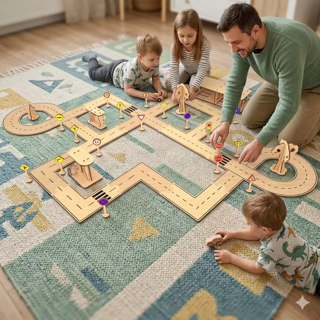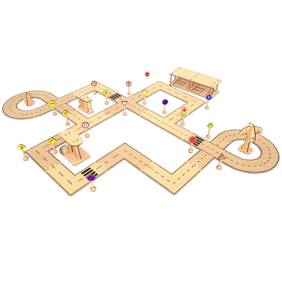 3 mm MDF malzemeden lazer kesim yöntemi ile üretilen şehir trafik parkuru, geniş oyun yüzeyi ve modüler yol tasarımı sayesinde kolay kurulum ve keyifli oyun deneyimi sunar.