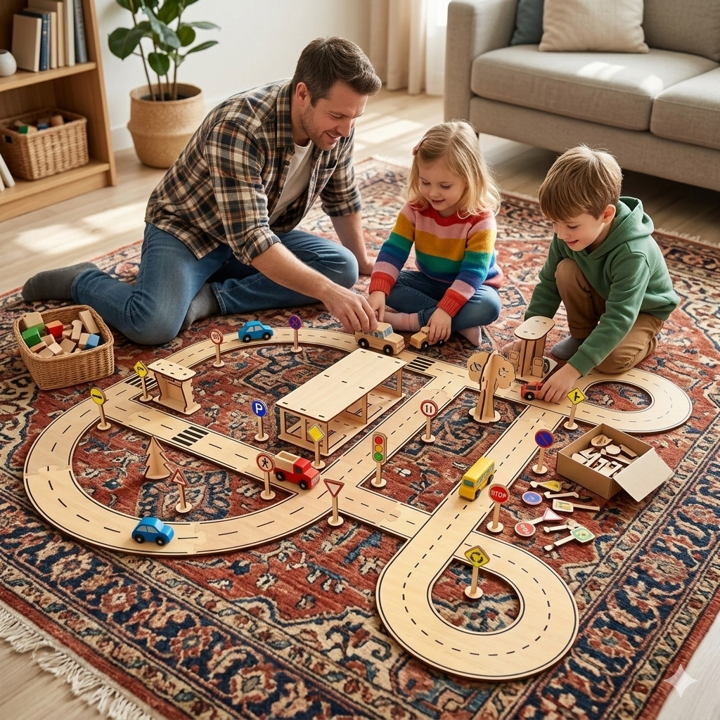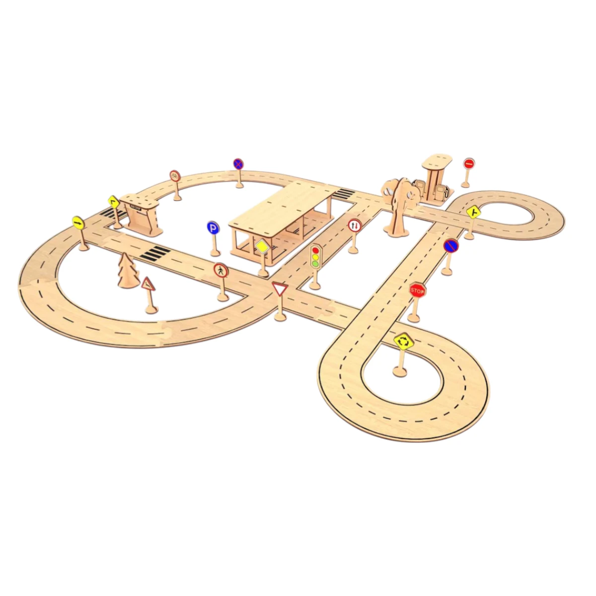 3 mm MDF malzemeden lazer kesim yöntemi ile üretilen trafik parkuru, geniş oyun yüzeyi ve modüler yol parçaları sayesinde pratik kurulum ve keyifli kullanım sunar.