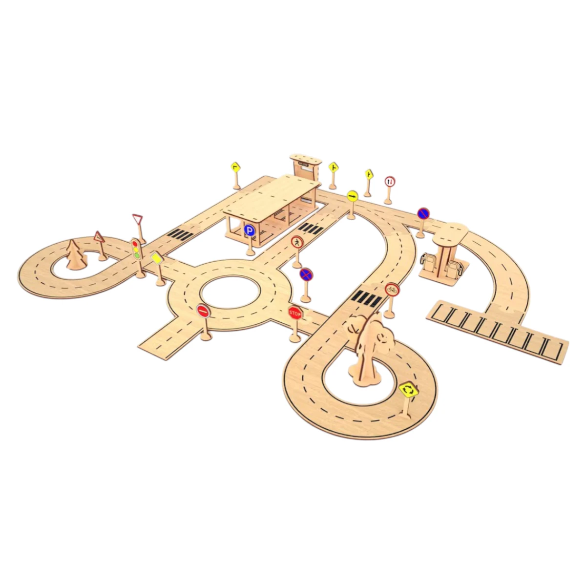 - Set içeriği: Yol parçaları, trafik levhaları, garaj, benzin istasyonu, durak ve ağaç maketleri