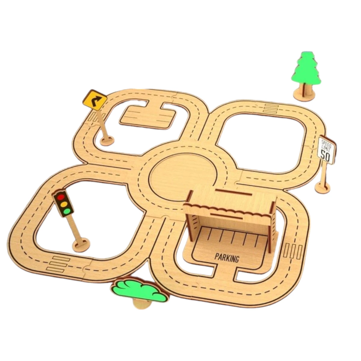 3 mm MDF malzemeden lazer kesim yöntemi ile üretilen trafik parkuru, geniş oyun yüzeyi ve modüler yol parçaları sayesinde kolay kurulum ve rahat kullanım sağlar.