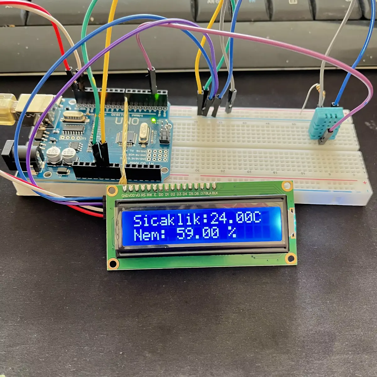 Cevap: DHT11 sensöründen okunan sıcaklık ve nem değerleri LCD ekranda sayısal olarak gösterilir.